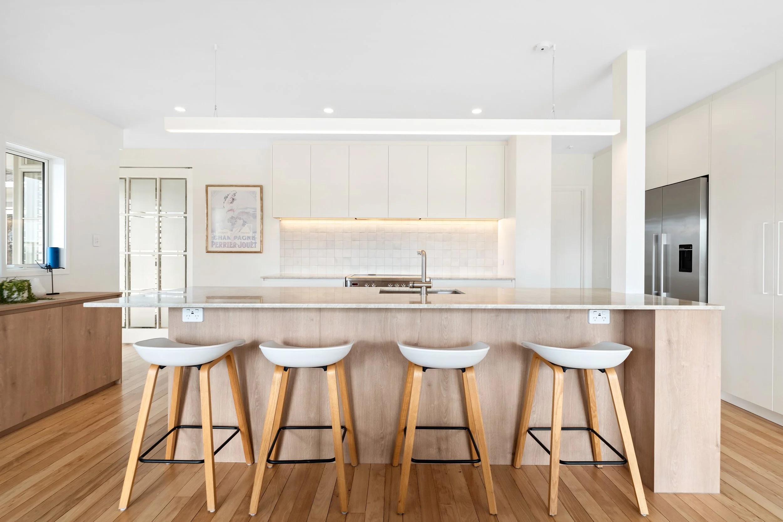 A calm, contemporary kitchen designed for everyday living. Warm timber tones and soft whites create a relaxed, inviting palette, complemented by natural stone surfaces and understated detailing. The generous island and built-in seating encourage connection, while thoughtful storage solutions keep the space feeling clean and uncluttered.